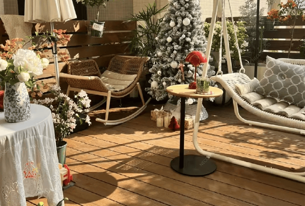 Ban công thường xuyên tiếp xúc với điều kiện thời tiết thay đổi. Không giống như gỗ tự nhiên, sàn Necowood WPC được làm từ hỗn hợp sợi gỗ và vật liệu polymer mang lại khả năng chống tia UV và mối mọt vượt trội. Ngay cả dưới mưa lớn, ánh sáng mặt trời hoặc độ ẩm mạnh, sàn Necowood vẫn duy trì màu sắc và tính toàn vẹn về cấu trúc, đảm bảo tuổi thọ lâu dài với sự biến dạng hoặc phai màu tối thiểu.