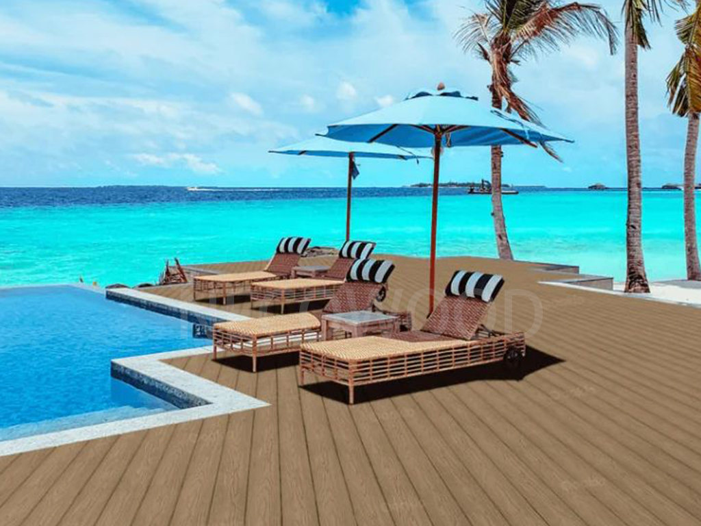 Ván sàn của Necowood có kết cấu vân gỗ tự nhiên giúp hấp thụ tia UV và nhiệt bức xạ, giảm độ chói đồng thời mang lại khả năng thoát nước và thông gió tuyệt vời giữa các tấm ván. Hoàn hảo cho khu vườn, sân hiên và khu vực bên hồ bơi, tấm ván này kết hợp sự ấm áp về mặt thị giác với hiệu suất kết cấu.