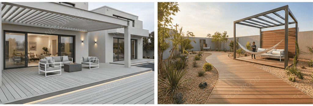 Đối với các biệt thự tư nhân ở các khu vực như Al-Asimah và Hawalli, trọng tâm là vật liệu có thể chịu được ánh nắng gay gắt của vùng Vịnh mà không bị cong vênh hay phai màu.