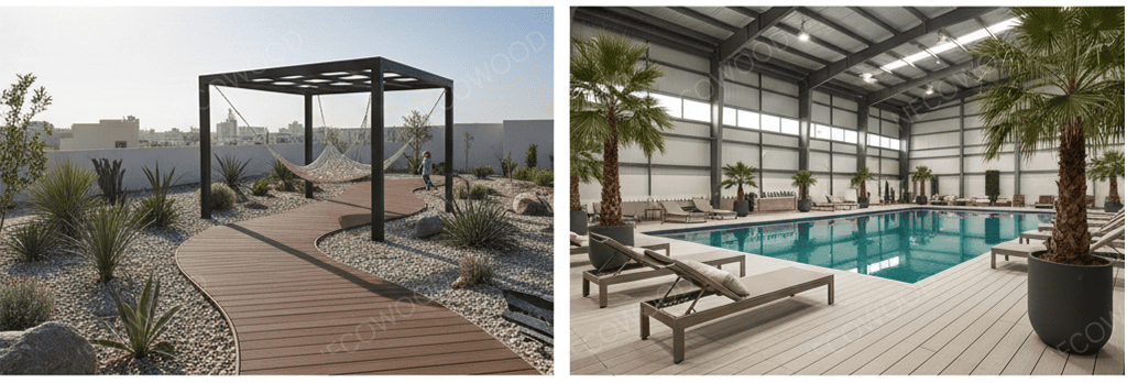 NECOWOOD sản xuất chất lượng caosàn gỗ nhựa compositeđặc biệt cho Trung Đông. Bảng mạch của chúng tôi có bộ ổn định ánh sáng tiên tiến để đảm bảo tuổi thọ màu trong môi trường có tia UV cao.